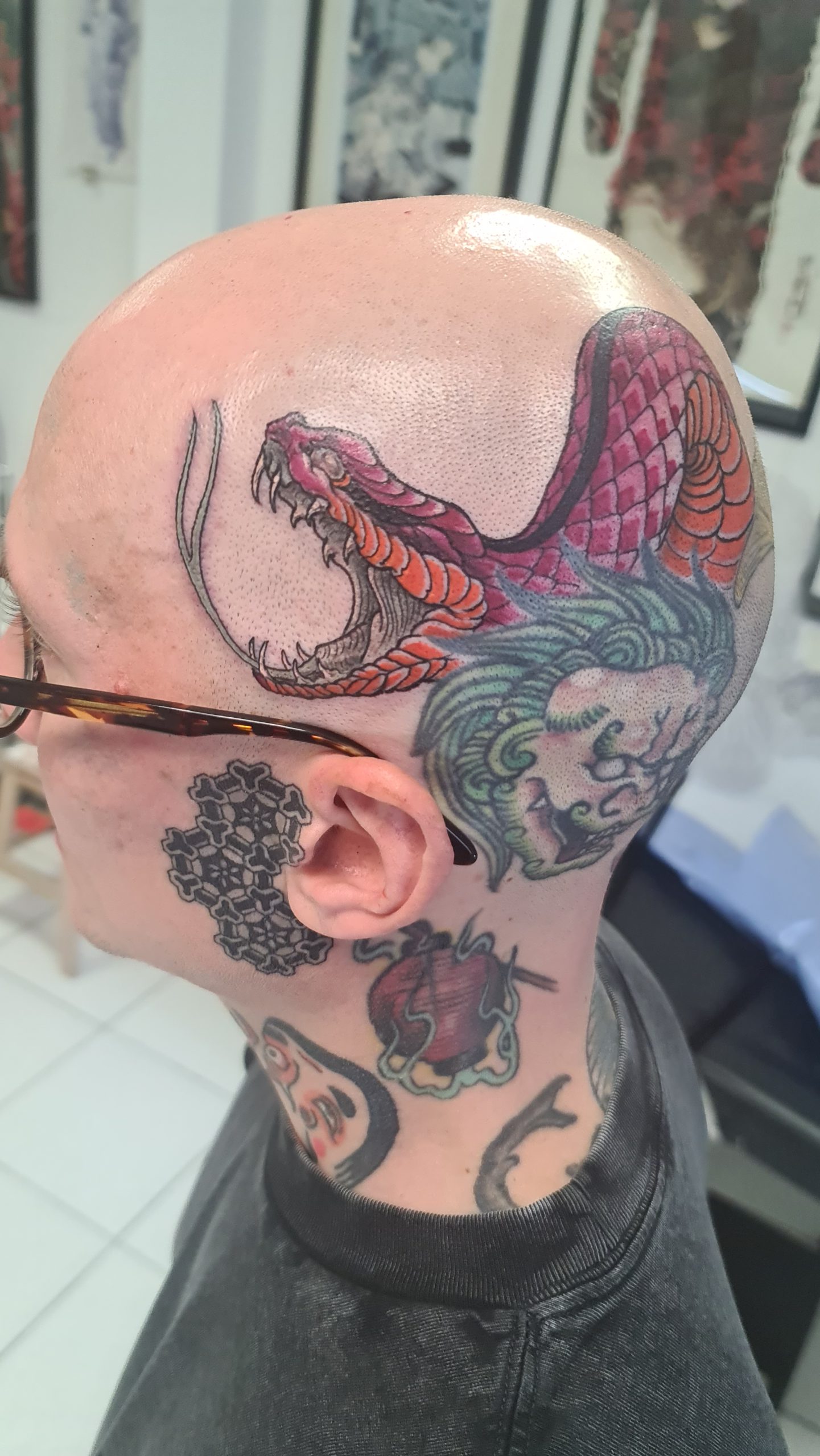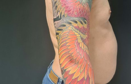 Les gravures Ukiyo-e étaient réalisées sur bois. Les tatoueurs traditionnels Irezumi ont repris ces images et les ont transférées sur le corps humain. Ils ont ainsi créé un répertoire iconographique profondément ancré dans l’héritage culturel des Japonais. Le tatouage néo-japonais, s’inscrit dans cette tradition, tout en ayant recours à une palette de couleurs vibrantes, des tons saturés et des effets de volume. Carpes koï, tigres, dragons, geishas ou masques kabuki, intègrent le tatouage néo-japonais. Les artistes tatoueurs donnent à ces images des nuances subtiles, des dégradés et une palette de couleurs riches pour former un style résolument moderne. Le corps offre un écrin qui permet la réalisation d’une grande fresque, un art que maîtrise Richard au studio de tatouage et de piercing Neon Cobra à Strasbourg.