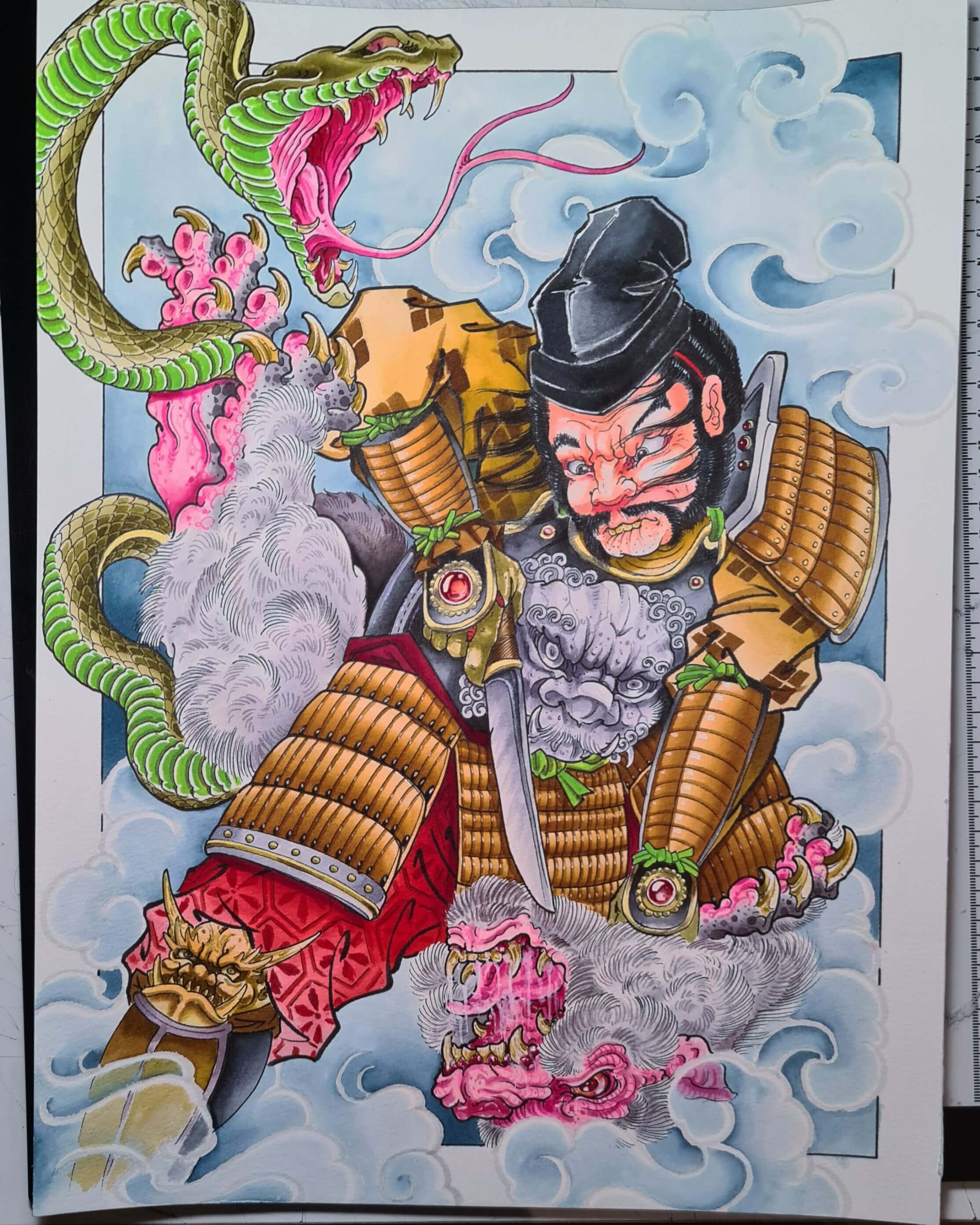 Dans un tatouage japonais traditionnel Irezumi, on n’assemble pas des motifs au hasard. Les éléments ne doivent être associés que s’ils sont compatibles. Les Kumo, (nuages) peuvent se déchaîner et s’associer au Raijin (tonnerre). Les images ont toujours une symbolique bien précise, les mythes et les légendes sont chargés de sens et créent une histoire complexe. Le tatouage néo-japonais reprend des éléments de la mythologie asiatique. Chiens Fu, démons, Baku, masques Oni et Hannya, végétaux ou animaux, un bestiaire épique popularisé par les maîtres de l’Ukiyo-e (estampes japonaises de l’ère Edo).